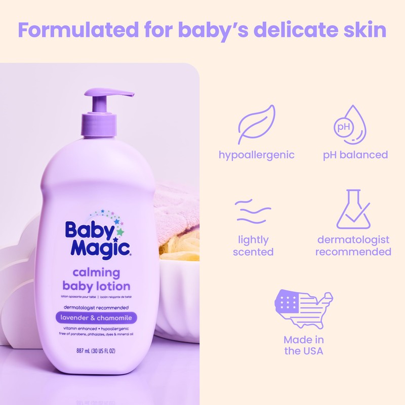 • To use: Gently massage Baby Magic Lavender Baby Lotion all over baby's body to soothe and relax. Apply lotion after using Baby Magic Lavender and Chamomile nighttime baby bath to complete your bedtime routine.
