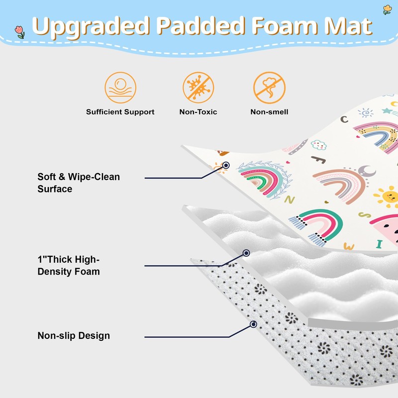 - Thicken Protection & Safety:Featuring 1-inch thick foam padding, the mat provides exceptional cushioning, safeguarding delicate knees and hands during floor play, providing a comfortable place for babies to play, explore, and develop motor skills.