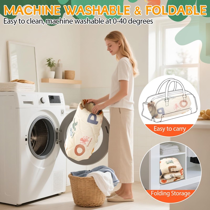 - FOLDABLE AND PORTABLE: The foldable play mat for baby is machine washable. The grid pattern and reinforced stitching ensure that it keeps its shape and remains intact during washing, eliminating concerns about cotton exposure. When not in use, you can fold it up and put it in a corner, the waterproof play mat mat provides a clean space for your family to have fun time anytime, anywhere.