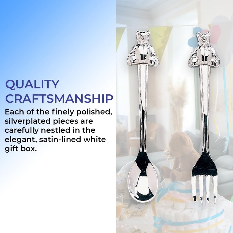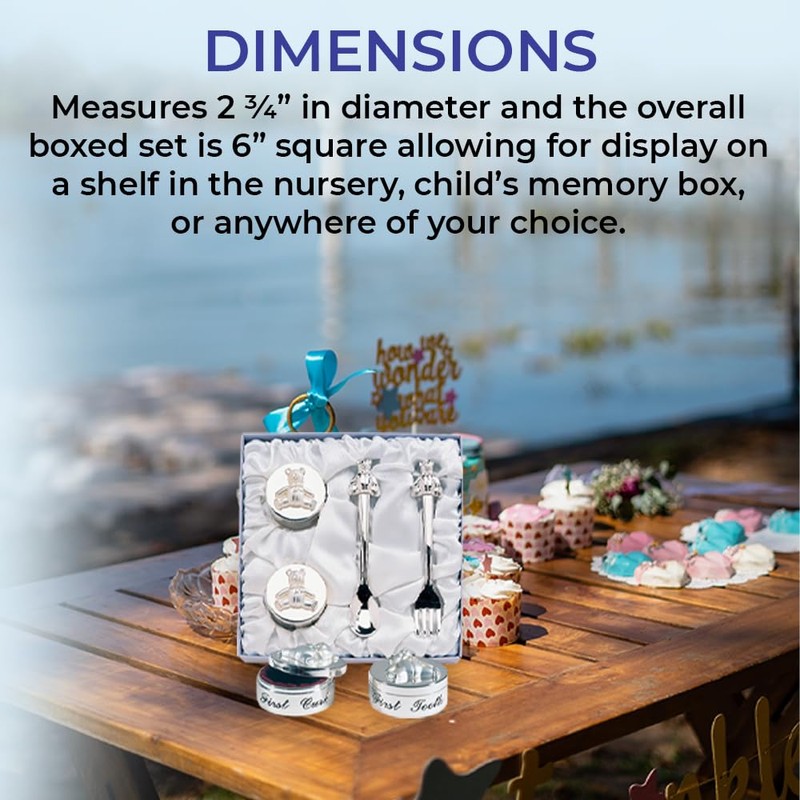 - QUALITY CRAFTSMANSHIP Each of the finely polished, silverplated pieces are carefully nestled in the elegant, satin-lined white gift box. The two round containers measure 2 ¾” in diameter and the overall boxed set is 6” square allowing for display on a shelf in the nursery, child’s memory box, or anywhere of your choice.