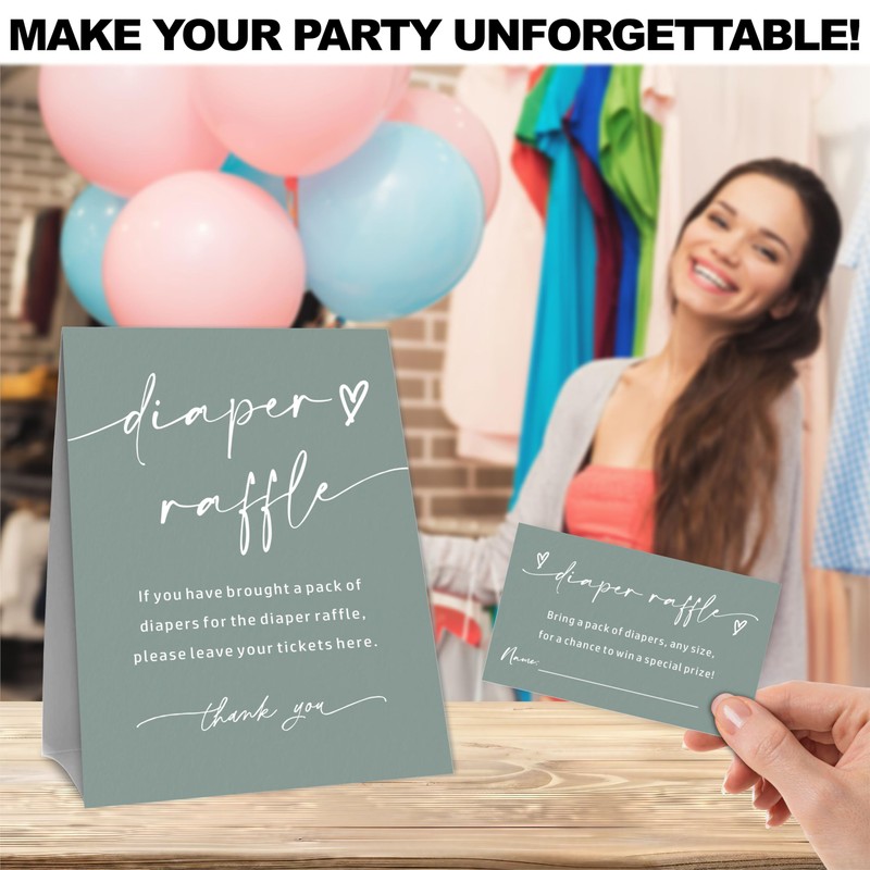Baby Shower Diaper Raffle Game Set, Baby Announcement, Baby Shower, Supplies & Decorations For Gender Reveal, 1 Turquoise Standing Sign & 50 Diaper Raffle Tickets - A03