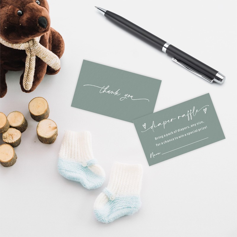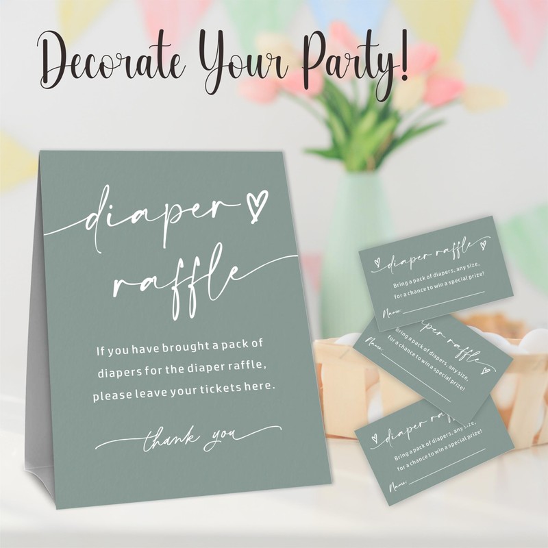 - Size: Our standing sign measures 5 x 7 inches and the diaper raffle tickets measure 2.1 x 3.5 inches.