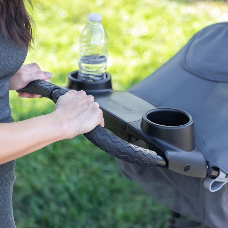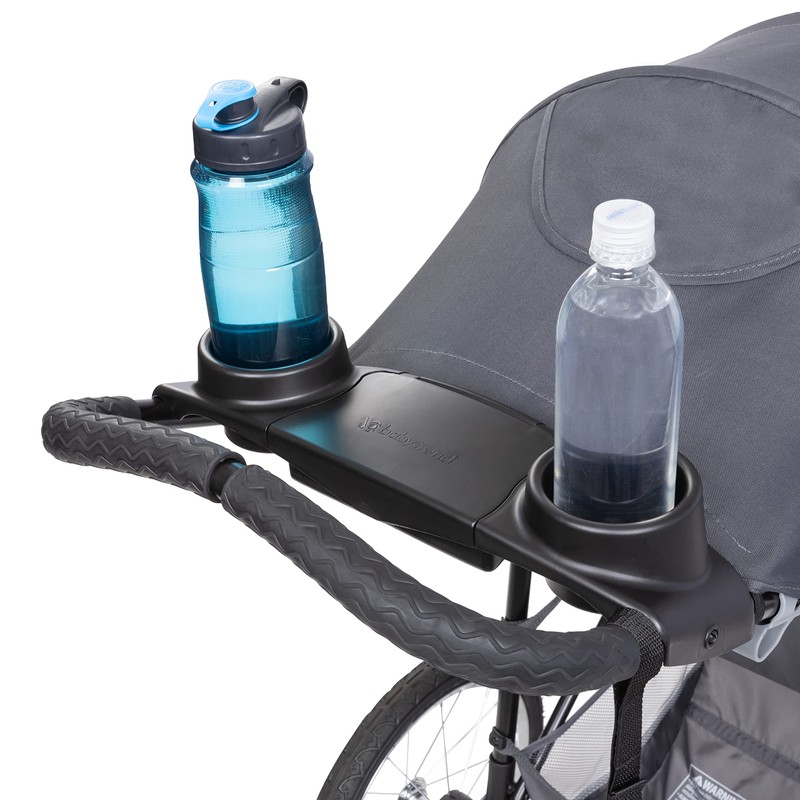 - Convenient parent tray includes two cup holders and covered compartment storage