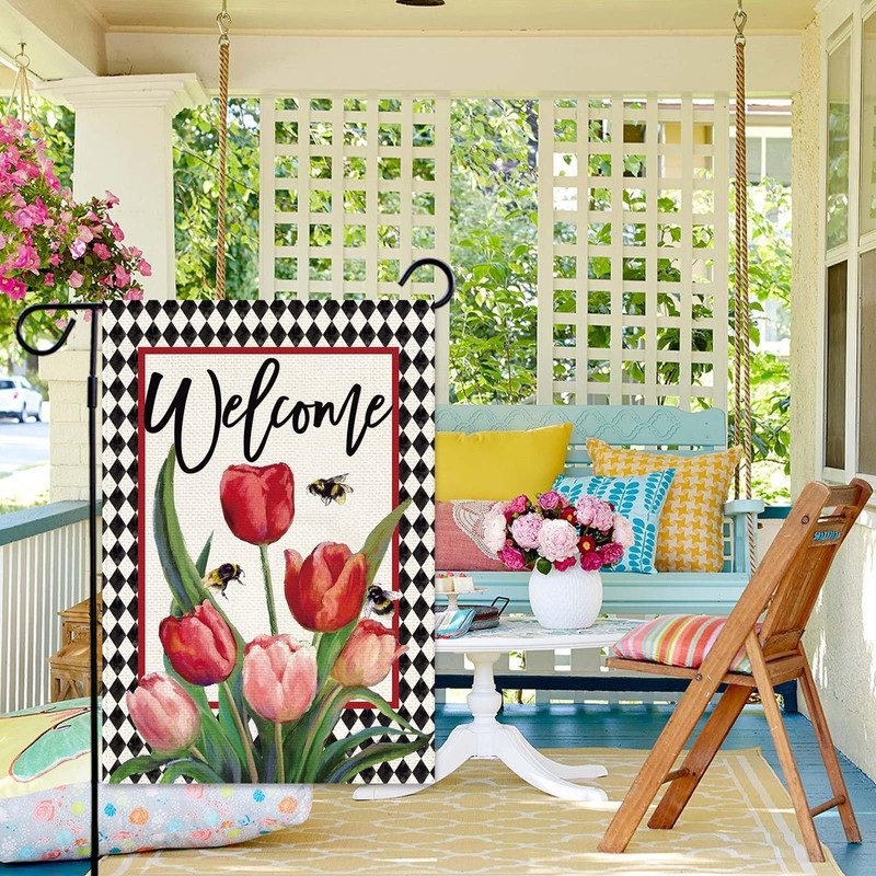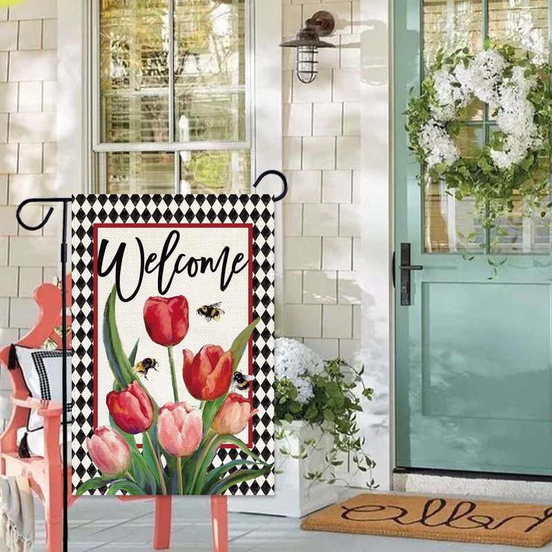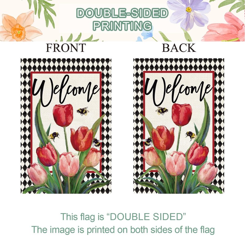 - Premium Fabric And Double Sided Printed: Spring summer tulip garden flags are made of upgraded heavy 2 layers persistent burlap fabrics. It is both sided well printed to make hosts And guests can see the welcome sign from any angel of the garden.