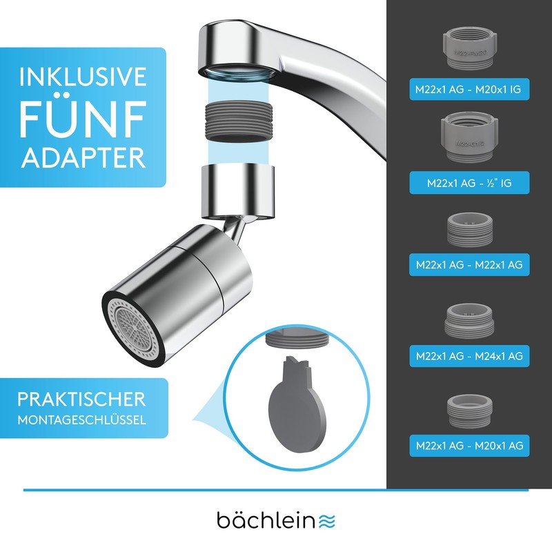 - Easy to install: with just a few simple steps, your tap can be equipped with the swivelling tap attachment within a few minutes - old aerator out, new attachment on it - done!