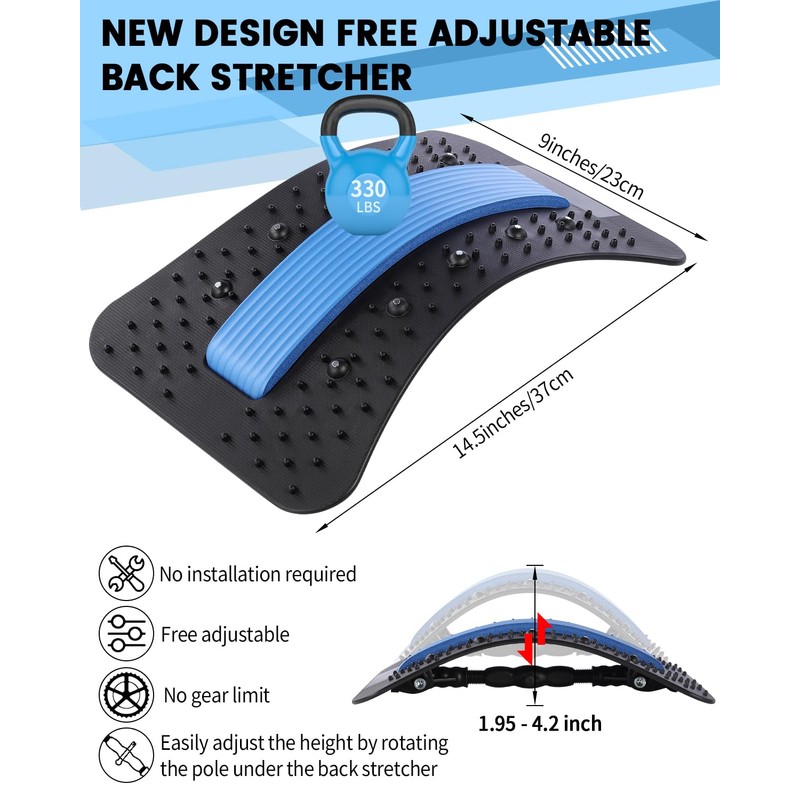 - 👍Upgraded & Innovative design - This back stretcher increases the contact area and massage contacts of the back, providing the most comfortable way for your back massage/spine decompression. Spine boards are equipped with foam strips to provide cushioning. It has Multi-leve adjustable curve settings that can be easily adjusted to achieve the desired stretching effect.