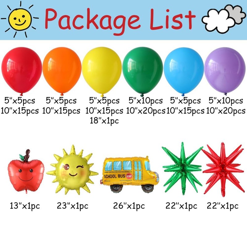 - Multiple Uses: This first day of school balloon garland is great for kids' parties, whether it's a back-to-school party or a kindergarten or primary school graduation party.It's also great for birthday parties and baby shower parties.
