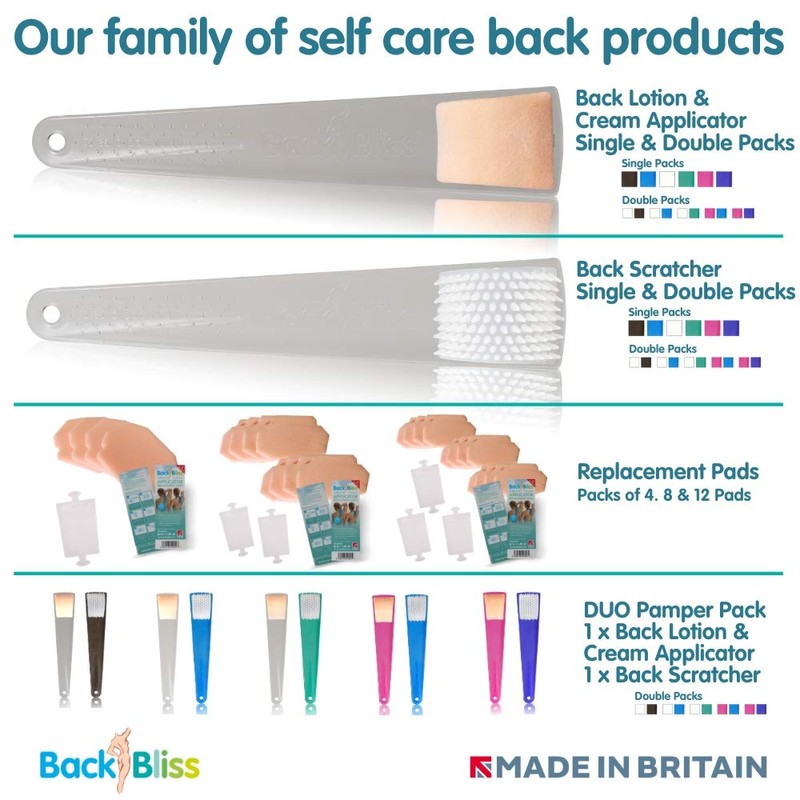 Your BackBliss arrives in its own transparent travel pouch, with additional pad, pad changing instructions and hang at home hook. Easily apply any lotions to your back with BackBliss and avoid unsightly back skin by using regularly. The long flexible handle allows you to spread cream evenly over your back and exert just the right amount of pressure to rub-in your lotion completely. The BackBliss handle works with the pliable lotion applicator pad back to mould to the exact contours of your back. Its this clever piece of design, combined with the velvet-like self-adhesive application pads, that make BackBliss truly unique. The pads are hygienic, easily washable up to 40°C and are thin enough not absorb any of your precious lotions or creams. The pad material is soft and velvety and kind to your skin. By using a BackBliss Applicator regularly you’d feel confident knowing that your back has been covered everywhere, you’d know that you are being kind to your back skin, whatever you need to apply. You’d be independent from asking anyone else to help you and you'd have complete control to apply your lotion at will, any time, any place, anywhere without having to bend, twist or contort yourself. A lotion and cream applicator from BackBliss will transform the way you care for your back skin. It’s so easy to use that you’ll want to bliss your back daily! A BackBliss Lotion Applicator is:- Long, sturdy and flexible Economic with lotion - the pads hold just the right amount - no wastage Hygienic with easy to clean washable replaceable pads Easily held, even with wet or lotioned hands. Made in England Caroline Wagstaff BackBliss’s inventor appeared on the BBC2 show Dragons’ Den and was a finalist in the British Female Inventor of the Year competition 12 years ago, when the product was launched.