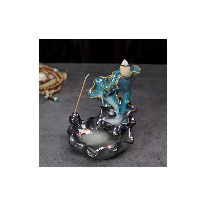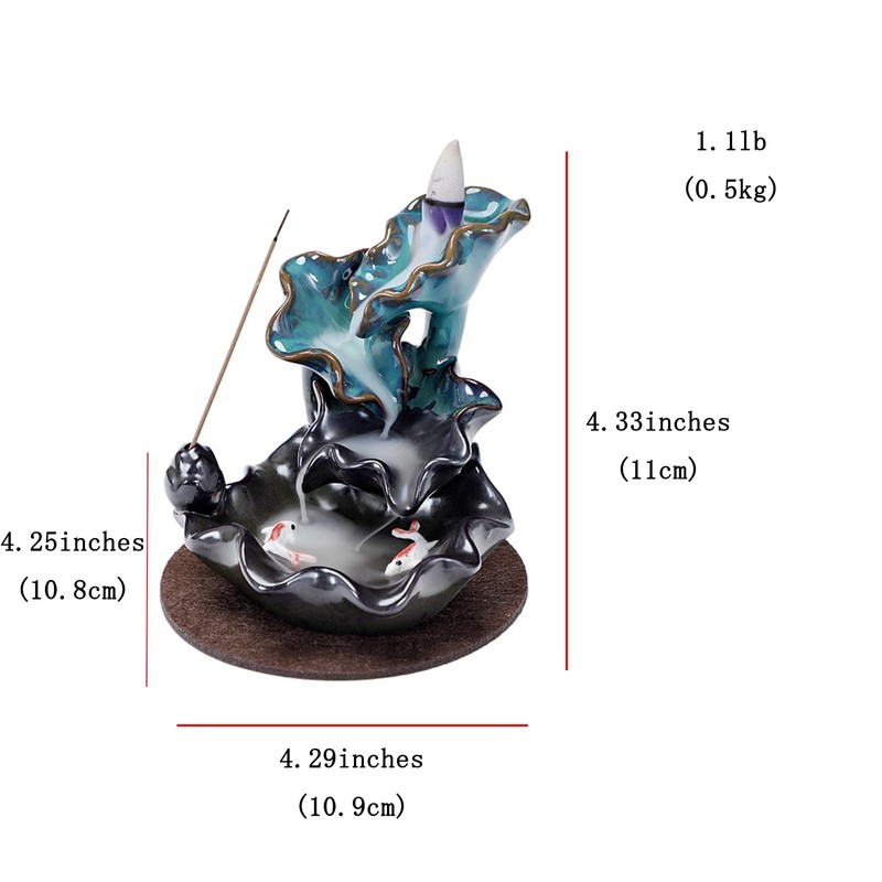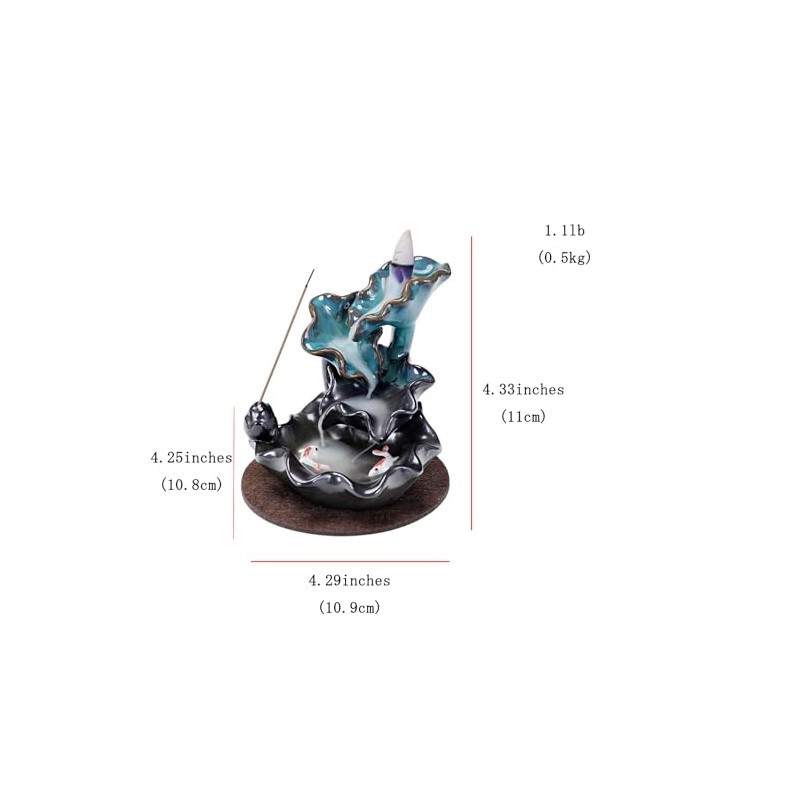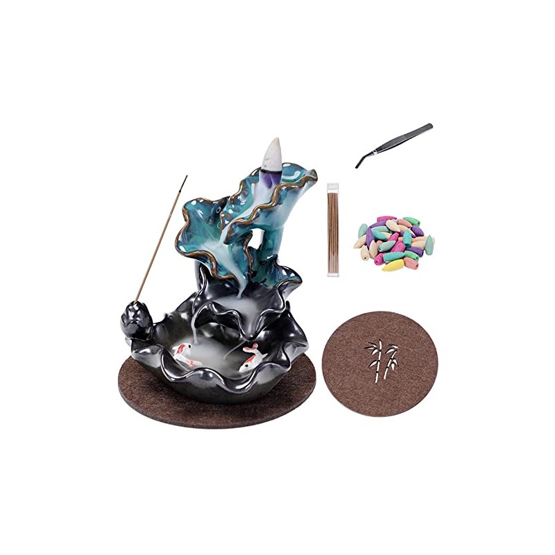 - Products include: 1 waterfall incense burner, 20 reflux incense cones, 30 incense sticks, 1 mat and tweezers.