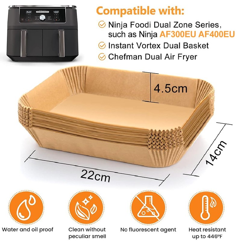 - 【Die suite besteht aus】Unser luftschleuderpapier hat die größe Von 14*22* 4,5 cm, das ist mehr als 125 stück. Das programm ist speziell mit Ninja AF300EU AF400EU,Princess und anderen Dual Zone Air Fryer Zubehör. Wenn die luftfeuchtigkeit vorbei ist, werfen sie das polster weg. Keine pfanne mehr muss gereinigt werden.