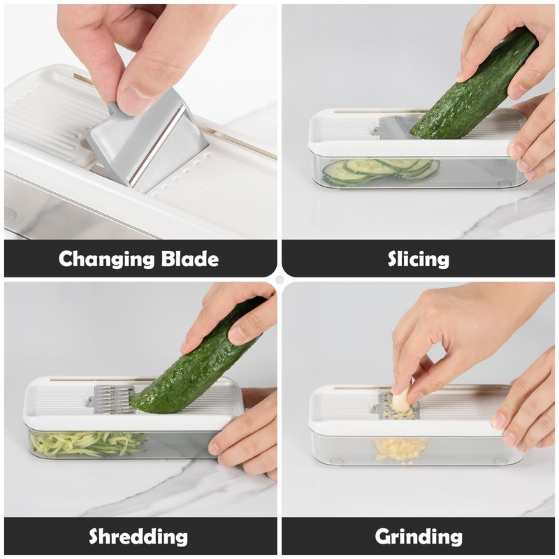 - NO MESS: This garlic slicer is equipped with a transparent container itself, so it's easier to check the food you slicing, shredding and grinding, but also provides a box to collect all blades well inside it. No harm risk in your kitchen drawer.