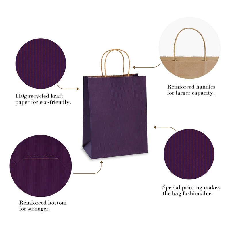 - Perfect Gift Bags Size: 8x4.25x10.5". 110g basis weight kraft paper with a serrated top edge. These purple gift bags are made of 100% Recycled Paper. FSC COMPLIANT. Green your life, BagDream paper bags would be your first choice.