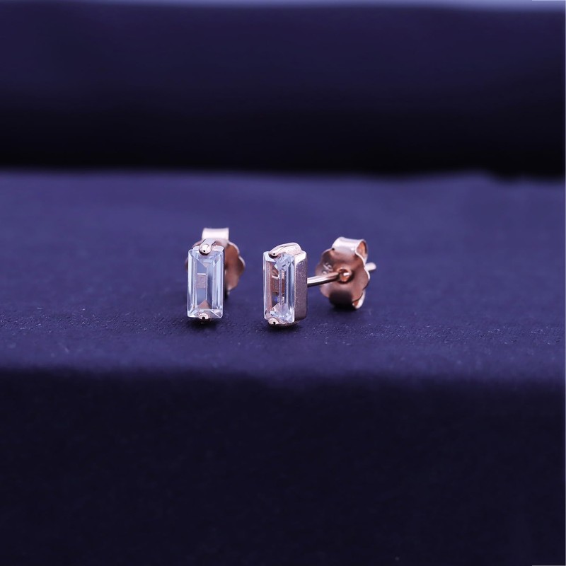Baguette Cut Prong Setting White Cubic Zirconia Dainty Stud Engagement Earring In 14K Rose Gold Over Sterling Silver, Push Back Earrings Gift For Women