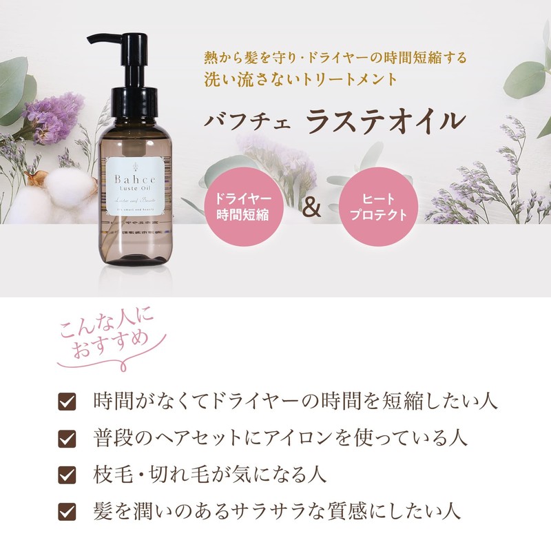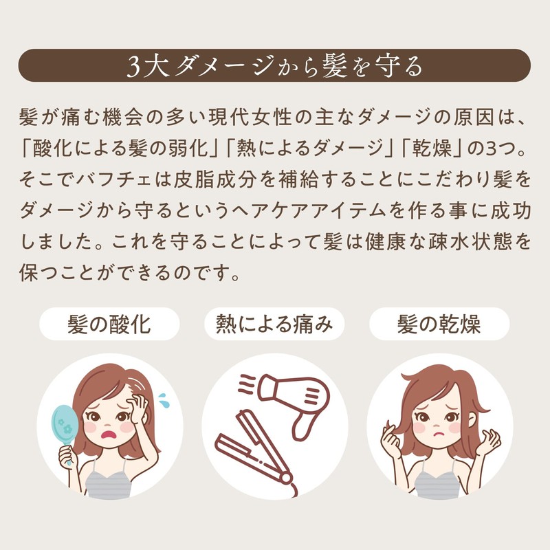 • Protect your hair from 3 damages: 3 main causes of damage to modern women who often often hurt their hair, "heat damage" "weakening hair due to oxidation, and "dry". Bafche is dedicated to supplementing sebum ingredients, making hair care items that do not damage your hair. It contains plenty of nutrients necessary for your hair such as iron, calcium, phosphorus and zinc, vitamins such as vitamin A, vitamin B, vitamin E, fatty acids such as oleic acid and linolic acid