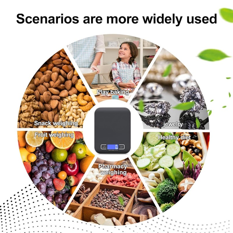 (1) You can switch between 6 units of measurement (g/kg/lb/oz/ml/milk-ml) to measure different foods and ingredients. This digital kitchen scale has been developed for better cooking, baking and healthier eating and is also ideal for measuring ingredients, jewellery, gold, letters, crafts and packages.