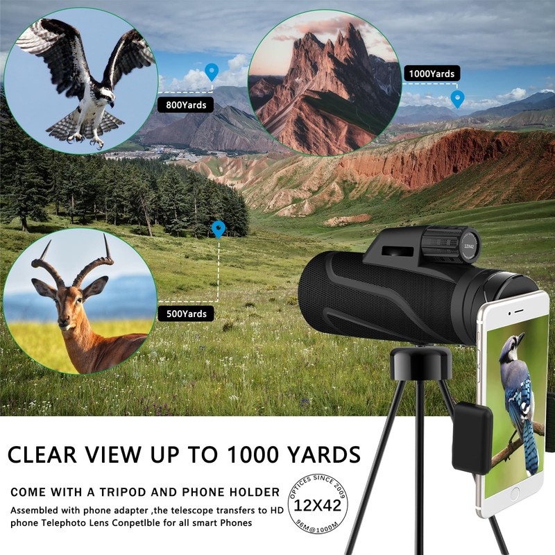12x42 Zoom Monokular Teleskop Erwachsene, mit Smartphone Halter Stativ,Robuste Gummiarmierung,für Wildtiere Vogelbeobachtung Wandern Jagd Camping,Ideal für Naturbeobachter