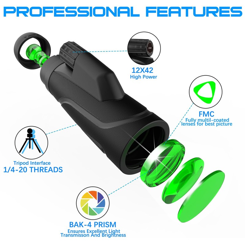 • 【12x42 leistungsstarke Vergrößerung】: Verbesserte 12-fache bis 42-fache Vergrößerung bietet breitere klarere und hellere Sicht. Stellen Sie die Vergrößerung dieses Zoom Monokular Erwachsene nach Ihren Bedürfnissen ein, so dass Sie die wunderbare Welt in voller Pracht sehen können.