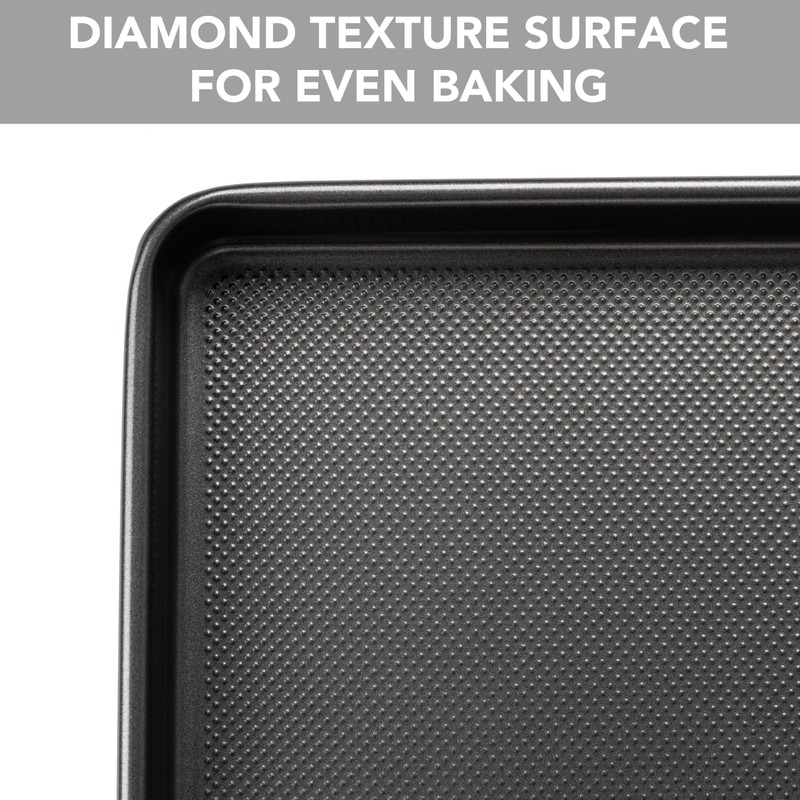 - DIAMOND TEXTURE - The baking sheet has a diamond texture on the base increases its non-stick properties and ensures even and quick heat airflow to the cookie, which makes the cookie consistently baked without any over or undercooked parts.