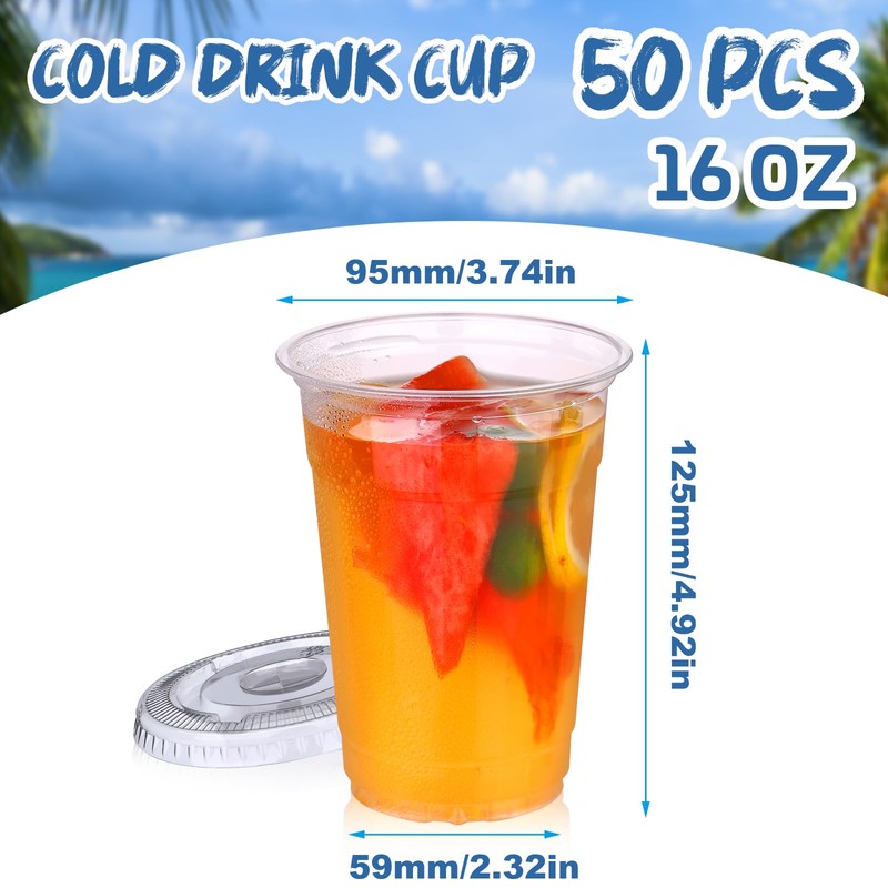 - Value Pack : This 16 oz clear disposable cold drink cup with flat lids set contains 50 set, This set contains 50 count cups and 50 count cup lids, a total of 100 count. 16 oz classic clear PET cup has a nice capacity capacity to make your life more comfortable, and the quantity of 50 set plastic cups is enough to meet your daily life needs.