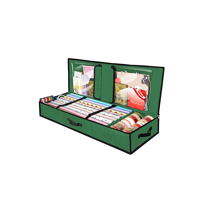 - 🌲 [EASY ACCESSIBLE] The flat paper organizer storage is designed to be easily hidden away underbed, above cabinets and in any shelves. Slim enough to put away anywhere, big enough to hold and protect every wrap paper rolls and accessories for the coming year after year. While in use, the extra clear vinyl pockets and flexible partitions makes it your own customizable wrapping center