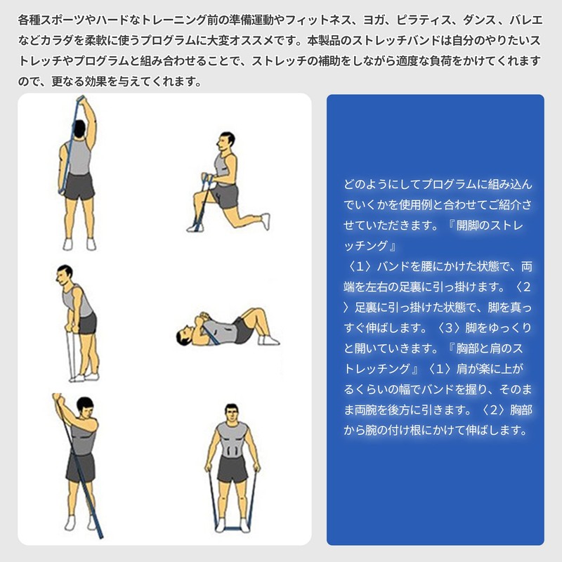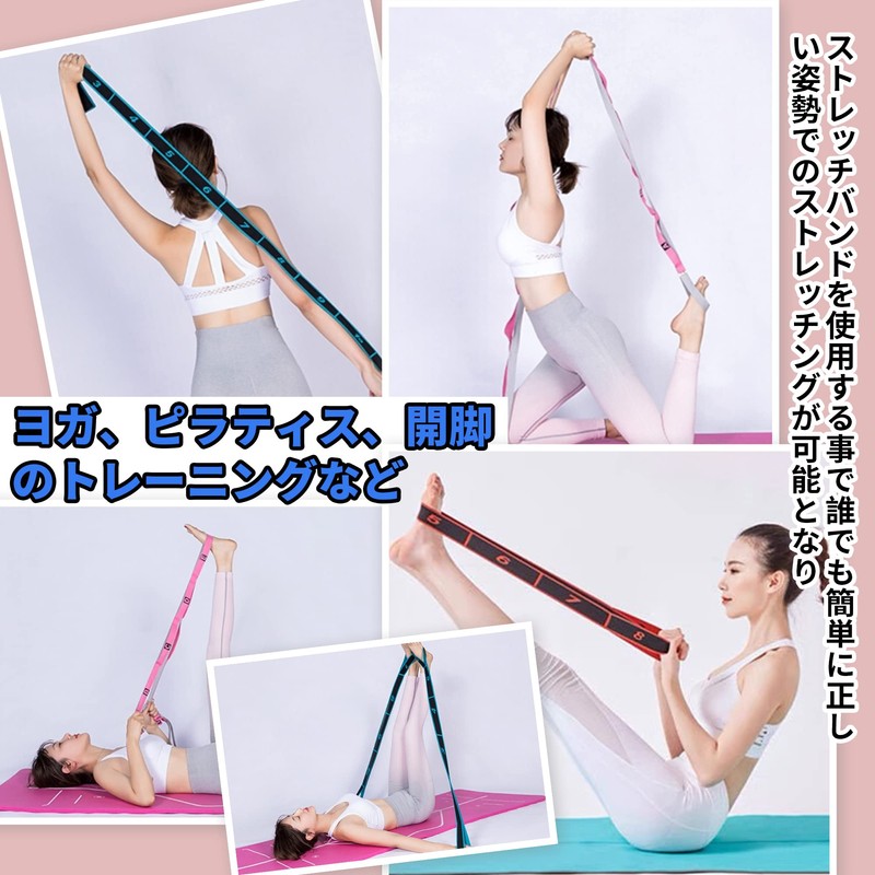 - (Yoga, Pilates, Open Leg Training, etc.) Highly recommended for various sports and pre-workout programs such as prep exercises, fitness, yoga, pilates, dance, ballet, etc. When combined with your own stretching or program, these stretch bands provide the right amount of stress while helping you stretch and achieve even more effect. We will give you some examples of how to incorporate into the program. Stretching leg opening: <1> With the band on your waist, hook both ends to the left and right soles of your feet. (2) Extends your legs straight when hooked on the sole of your foot. 3. Slowly open the legs. (Chest and Shoulder Stretching) (1) Hold the band at a wide enough that your shoulders can easily raise and pull both arms backward. 2. Stretch from chest to base of arm