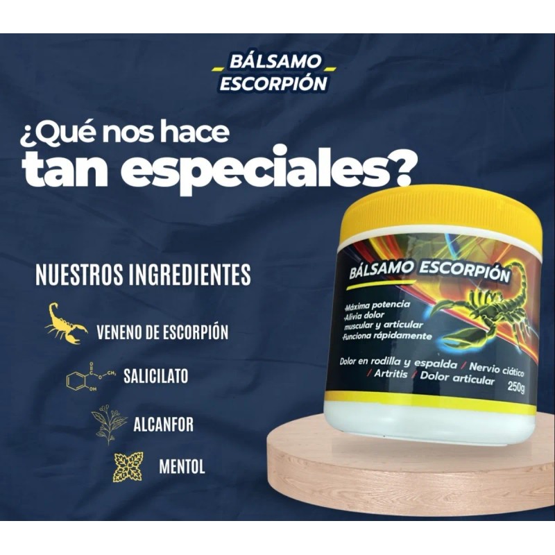Alivia eficazmente dolores en espalda, rodillas, cuello, brazos, piernas y más gracias a su fórmula con veneno de escorpión, mentol, alcanfor y salicilato de metilo. Este bálsamo actúa rápidamente sobre músculos y articulaciones afectadas por artritis, lumbalgia, ciática, contracturas y esguinces.
