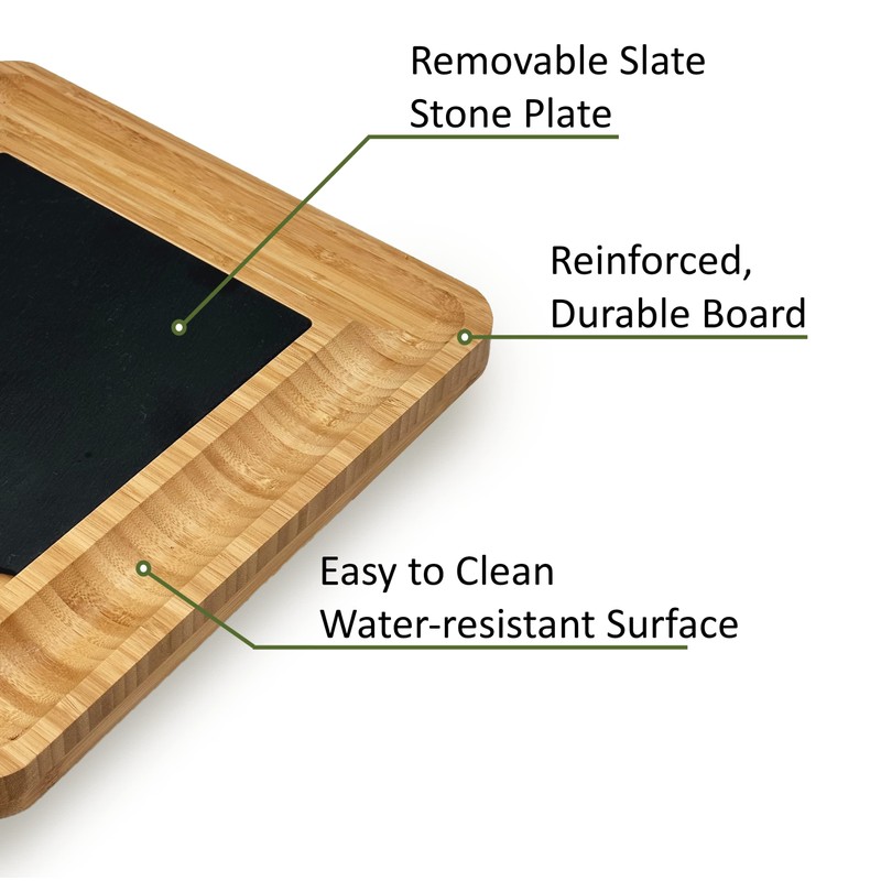 - ✔QUALITY — Our bamboo charcuterie board is made of solid, natural bamboo that is spacious enough for any kind of serving. A set of stainless steel cheese knives give you the right tools to impress your guests. The non-porous slate stone plate keeps intensely-flavored meat and cheese smells from lingering