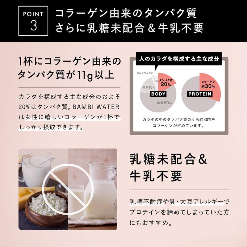 - [Made with only natural sweeteners! This beauty drink uses collagen-derived protein.] It's free of artificial sweeteners and lactose! It's gluten-free and recommended for those who don't like traditional protein! It contains 11 types of functional foods, yet is low in calories, sugar, and fat! Just one cup provides essential nutrients that busy modern women often lack!