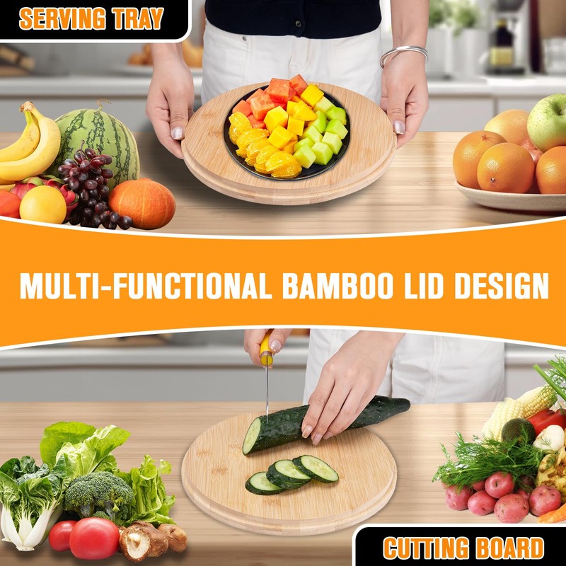 versatile bamboo lid that doubles as a cutting board or serving tray.