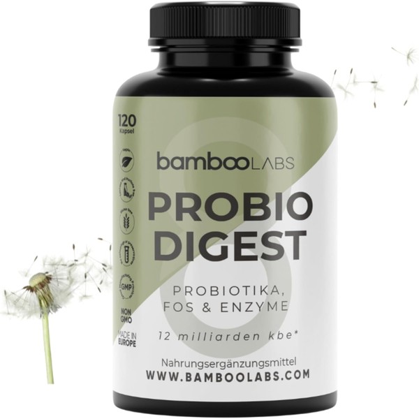 Bamboo Labs - Prebiotics and Probiotics Capsules, 3 Strains with +12 Billion CFU + Powerful Digestive Enzyme Complex, 120 Probiotics Intestinal Restoration Capsules, Supports Digestive + Intestinal
