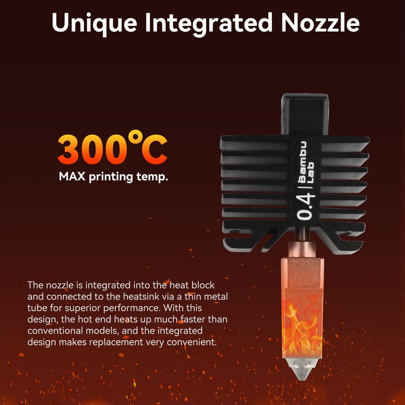 - 【Unique Integrated Nozzle】The nozzle is integrated into the heat block and connected to the heatsink via a fine metal tube for optimal performance. With this design, the hotend heats up much faster than a traditional hotend, and the integrated structure effectively reduces potential issues when replacing the nozzle.