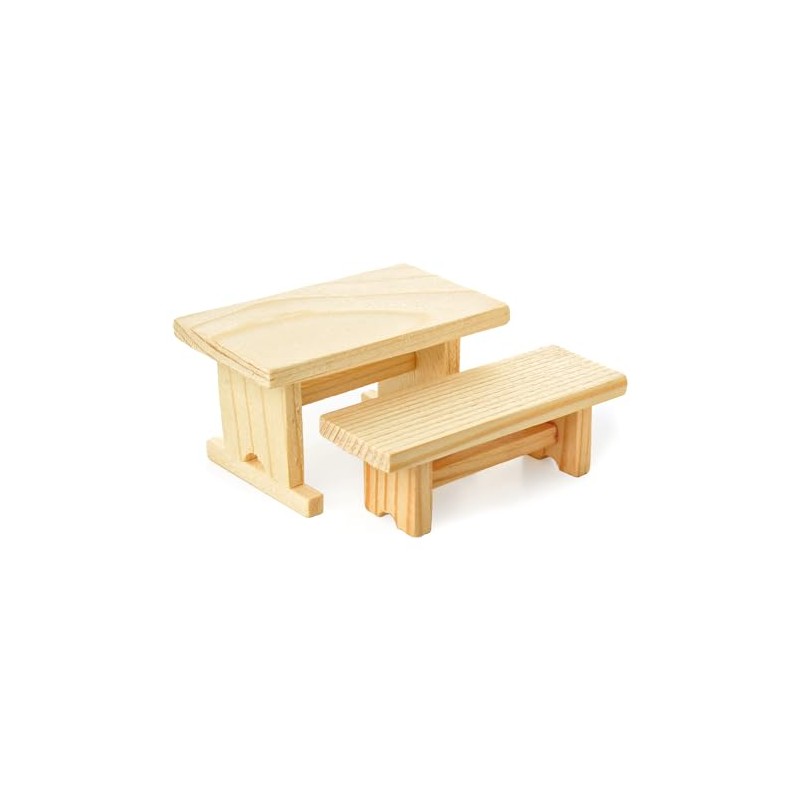This cute set, consisting of a table and bench, looks absolutely detailed in its replica. Both are made of wood. The table has a size of approx. H 4 x W 4.3 x L 7.3 cm and the bench approx. H 2.2 x W 2.5 x L 7.3 cm. The set is perfect for miniature crafts or decorating dollhouses and merchant shops.