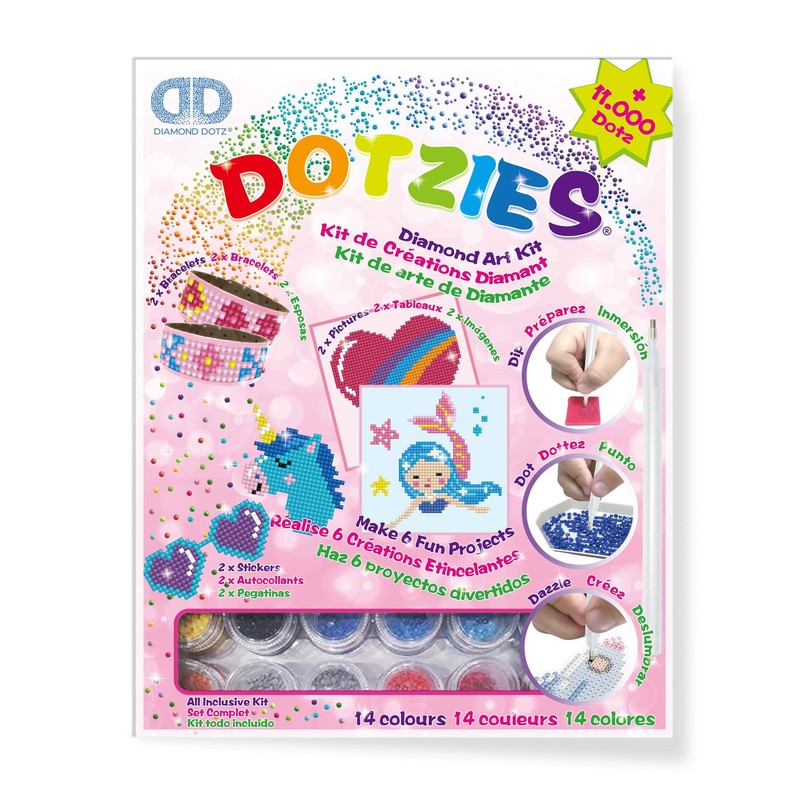 - DIAMOND ART FOR KIDS: Dotzies Mermaid Art Kit provides everything for 6 projects—2 pictures, 2 stickers and 2 bracelets; easy and fun diamond painting for creative kids