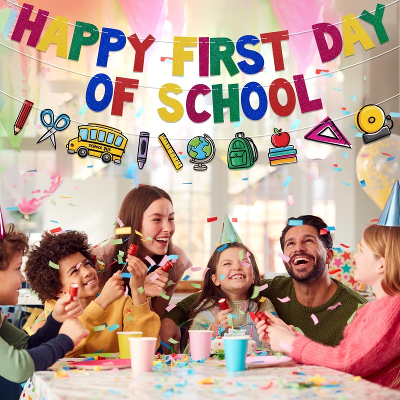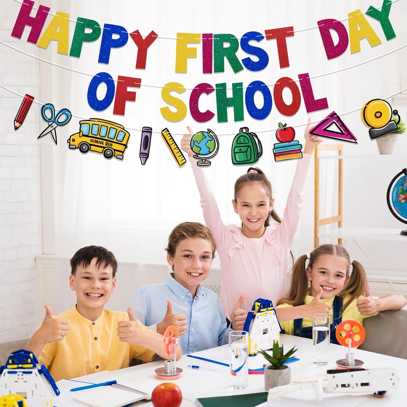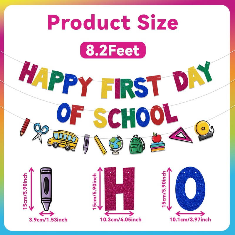 - Diseño único: meticulosamente diseñado a mano, nos aseguramos de que nuestras banderas multicolor con purpurina Happy First Day of Schooll fueran súper premium y únicas. Perfecto para tu fiesta escolar y también diferenciará tu celebración escolar