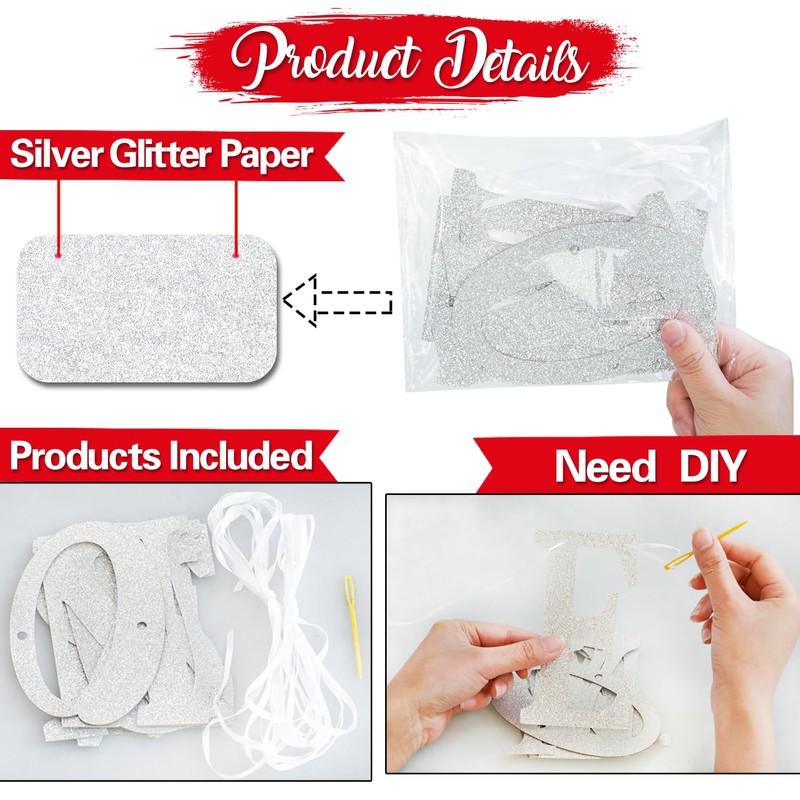 - Requiere montaje. Ten en cuenta que tendrás que montar estas banderas por tu cuenta. ¡Es muy fácil! Todo lo que necesitas hacer es enhebrar la cuerda a través de la aguja y luego utilizar la aguja para enhebrar la cuerda a través de los dos agujeros para cada palabra.