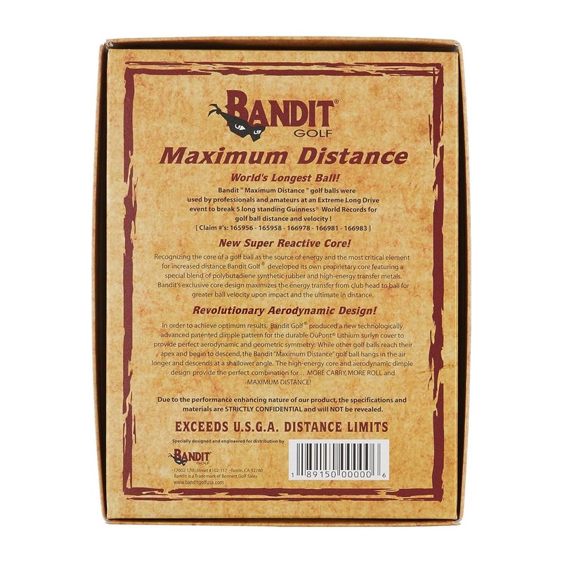 What are the best golf balls for my game? Striking the ultimate balance of performance and distance, these long distance golf balls are especially engineered with an amazing DuPont Lithium Surlyn cover, it delivers incredible performance. The Bandit MD Golf Balls offers a new super reactive core, developed with its own proprietary core featuring a special blend of polybutadiene synthetic rubber and high-energy transfer metals. This allows maximum energy transfer from club head to golf ball for World-Record setting distance and velocity. Yet our revolutionary aerodynamic dimple design also allows for incredible distance and absolute smooth control. You will not find another golf ball out there that provides the incredible performance of speed, distance and control, which exceeds USGA's distance Limits. Don't buy just any ordinary discount golf balls. Buy the world's longest golf ball. Bandit MD Golf Balls set records World Records. Is our golf ball illegal? If it is, then some of the golf pants that people wear should be illegal as well!