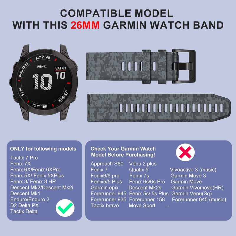 - đCompatible Models: This 26mm width sport garmin fenix 5x watch band compatible with Garmin Fenix 7X/Enduro/Fenix 6X Pro/Fenix 6X/Fenix 5X Plus/Fenix 3/Fenix 3 HR/Descent Mk1/D2 Delta PX/Tactix Delta.Please refer to picture 3 for details of the compatible models.