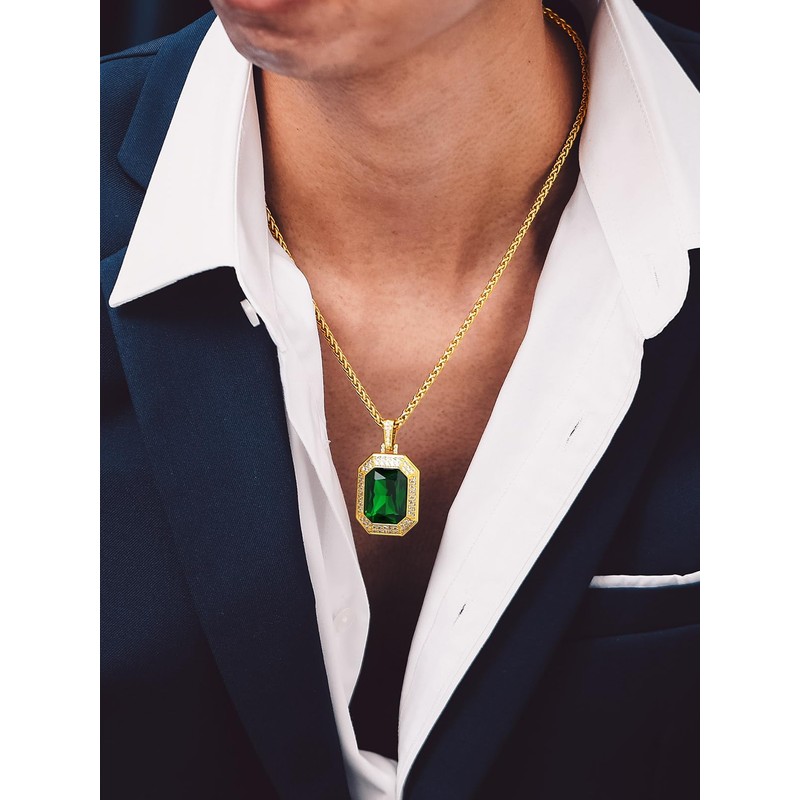 Bandmax Big Gemstone Pendant Necklace for Men 14K Gold Plated Iced Out Green Crystal Necklace Emerald Charm with Spiga Chain Hip Hop Rock Biker Jewelry