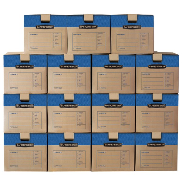 Bankers Box Medium Prime Moving Boxes, Tape-Free FastFold with Reinforced Handles and Attached Locking Lid (Pack of 15)