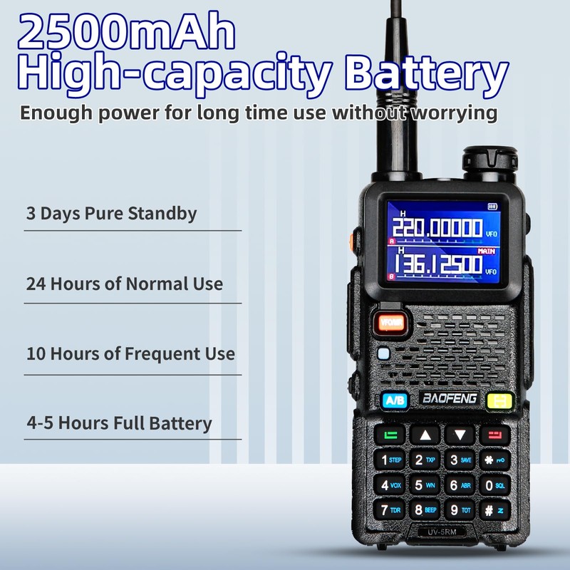 - Long - lasting Battery Life-To meet the needs of long - term use, the [BAOFENG] walkie - talkie is equipped with a large - capacity lithium - ion battery, significantly improving its battery life. One full charge can meet a full day of high - intensity use, reducing the number of charging times and bringing great convenience to users. Meanwhile, it supports fast - charging function, which can replenish power in a short time to ensure that there is no power outage at critical moments.