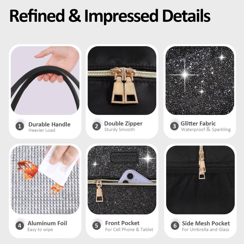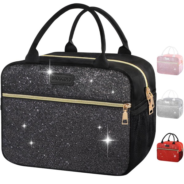 BAOGCOYO Lunch Bag For Women, Leakproof Glitter Lunch Box, Cute Lunch Tote Bag Adult, Large Capacity Insulated Reusable Cooler Lunch Containers for Work Travel Picnic or Office (Black Bling Sparkle)
