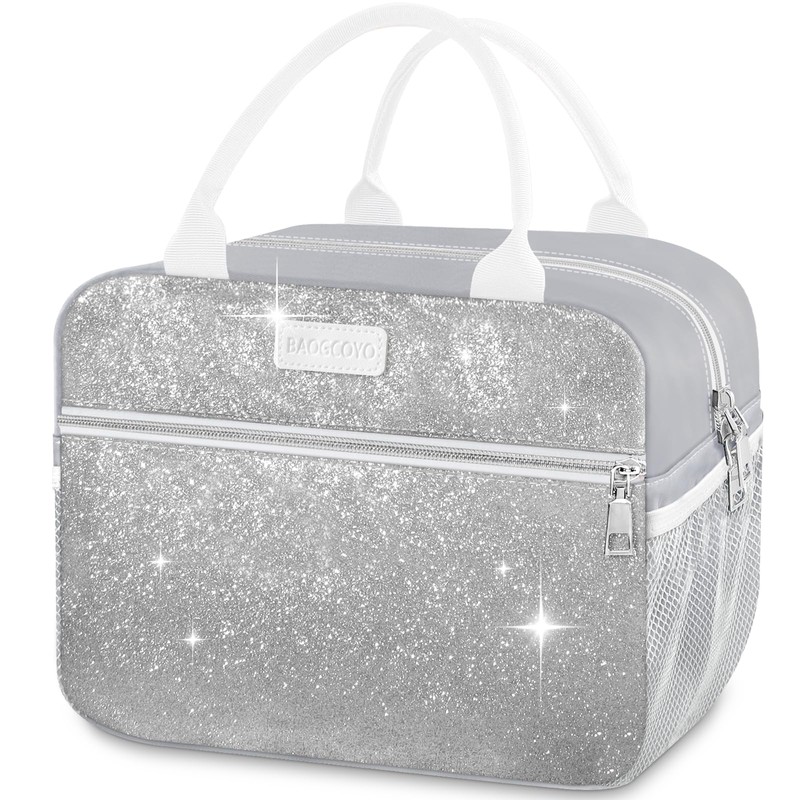 BAOGCOYO Lunch Bag For Women, Leakproof Glitter Lunch Box, Cute Lunch Tote Bag Adult, Large Capacity Insulated Reusable Cooler Lunch Containers for Work Travel Picnic or Office (Silver Bling Glittery)