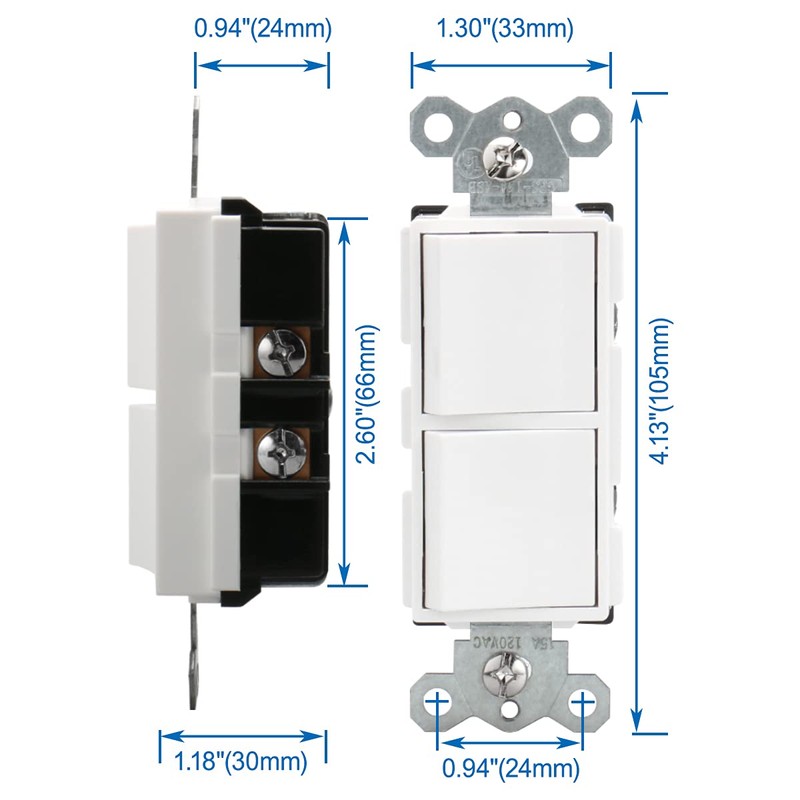 * Compact dual switch helped correct two full-sized rough and unsightly "jimmy-rigged" electrical switches originally put in place, one above the other in a narrow wall cavity to our home-office, probably as a temporary solution to control two sets of lights. * Now it has a clean, professional look and enhances functionality.
