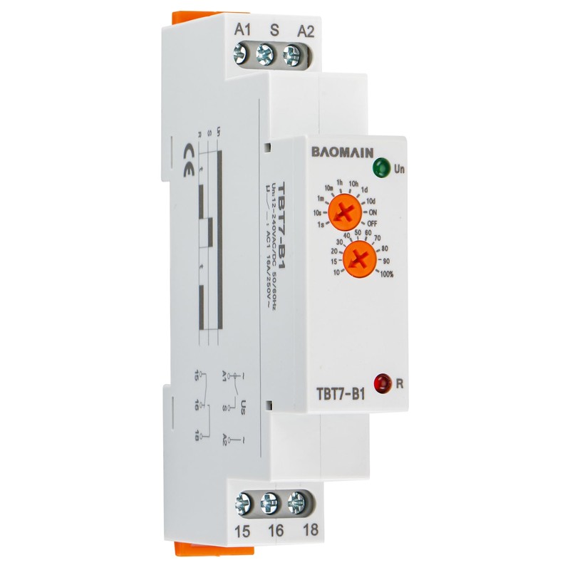 Baomain Multi-Function Time Relay, 16A/AC250V, Delay ON SPDT, DIN Rail Mounting Timer Relay (1-SPDT, 12-240VAC/DC)