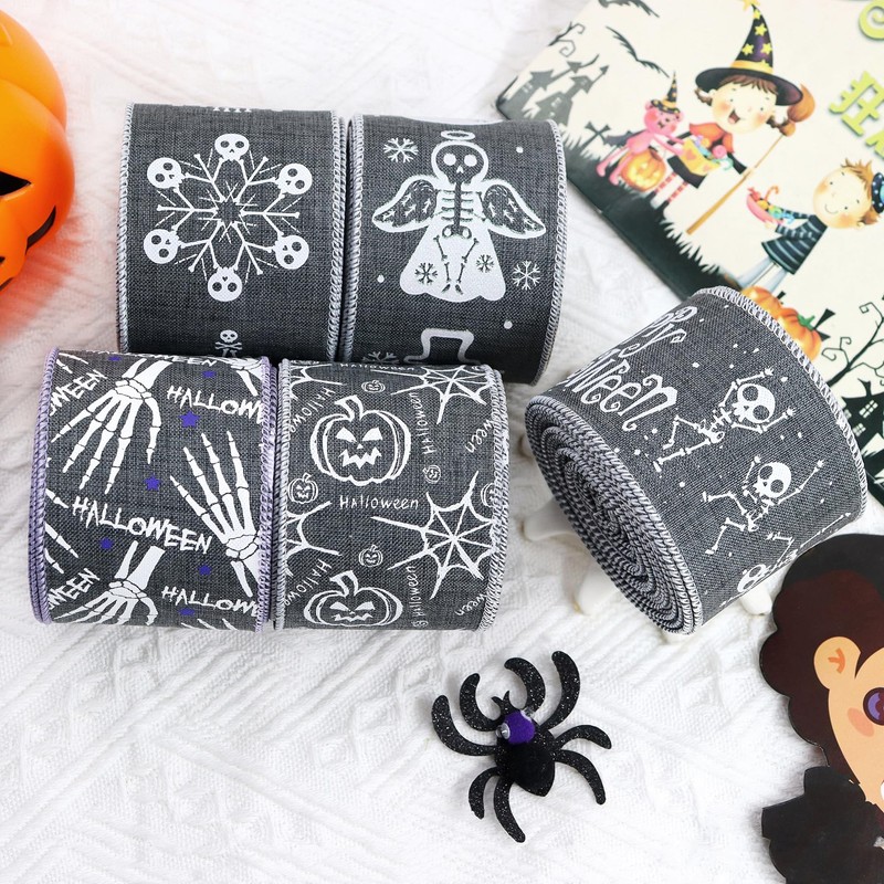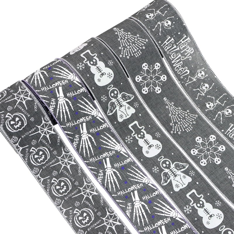 BAORJCT 30 Yards Halloween Wired Edge Ribbons, Grey White Skeleton Ghost Hand/Candy Skull Frame/Pumpkin/Spider Web for Halloween Home Wreath DIY Craft Bows, Party Decor, Trick or Trea