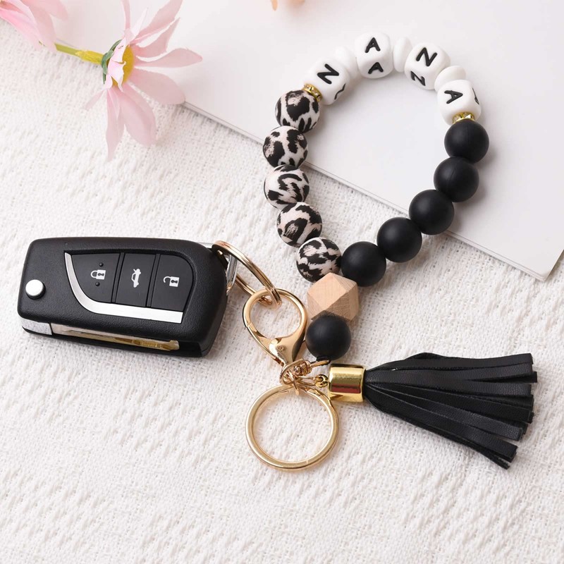 BAOSIWA Silicone Beaded Nana Key Chain Bracelet Wristlet Keyring Black Leopard Bangle Keychains Christmas Day Gifts for Women Grandma with Leather Tassel