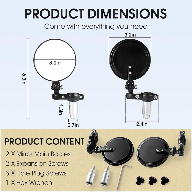 Include Mirror Hole Plugs :Come with everything you need.Include mirror hole plugs, perfect to protect your mirror hole thread from water, dust and mud. Simply screw it onto the motorcycle mirror hole cover by hand,easily and without any tools.