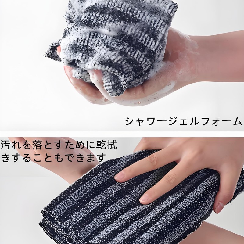 • 【効率的な洗浄】白黒のストライプ柄のデザインは、少量のシャワージェルで素早く泡立ち、全身を簡単に清潔にし、ボディタオル メンズ 入浴中の角質や汚れの除去に特に適しています。ボディタオル 角質除去