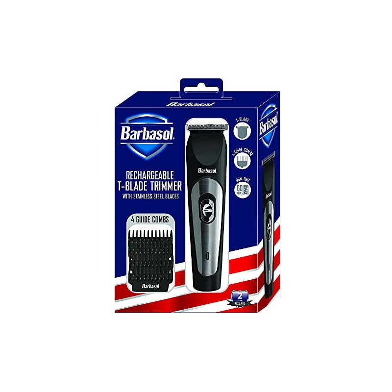 Barbasol Rechargeable Men’s T-Blade Trimmer With Stainless Steel Blades, 4 Guide Combs Included: 3mm, 6mm, 9mm, 12mm, Rechargeable, 60 Minutes Of Shaving Time, Easily Washable