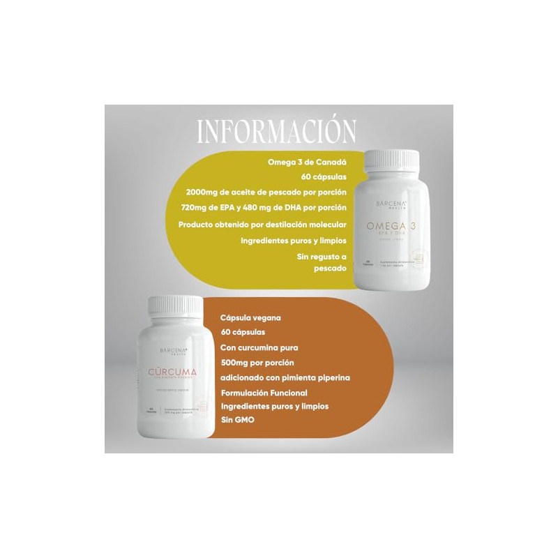 BARCENA HEALTH - Kit Básico | Cúrcuma Pura 500mg + Omega 3 (DHA y EPA) | Ingredientes Limpios y Puros, Gluten | Free | Sugar Free | Vegan | Sin Conservadores